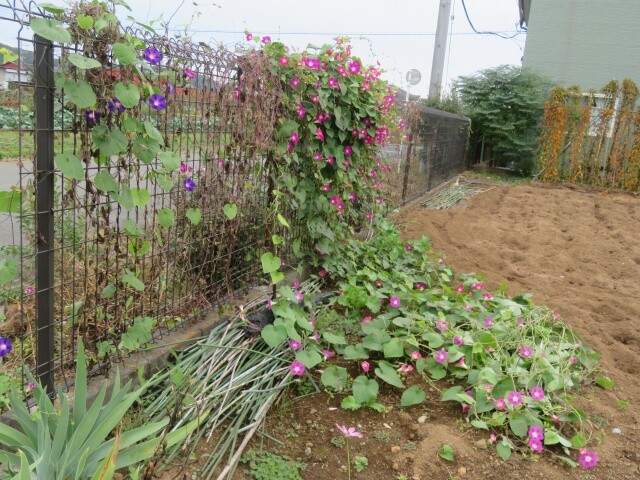 2025年11月02日 その後の丸葉朝顔、空芯菜 1週間のご無沙汰でした。 11月も日曜日の投稿だけで参りますので、よろしくお願いいたします。 再登場ですが、裏の畑の丸葉朝顔が、まだたくさん咲いています。 (10月31日撮影) ビッシリ咲いています。 うちのシモツケの葉が、少し紅葉していました。 向いの空芯菜の花ヨルガオの花によく似ていますが、一回り小さいです。 では、また一週間後にお邪魔いたします。 タグ :#丸葉朝顔#シモツケ#空芯菜の花